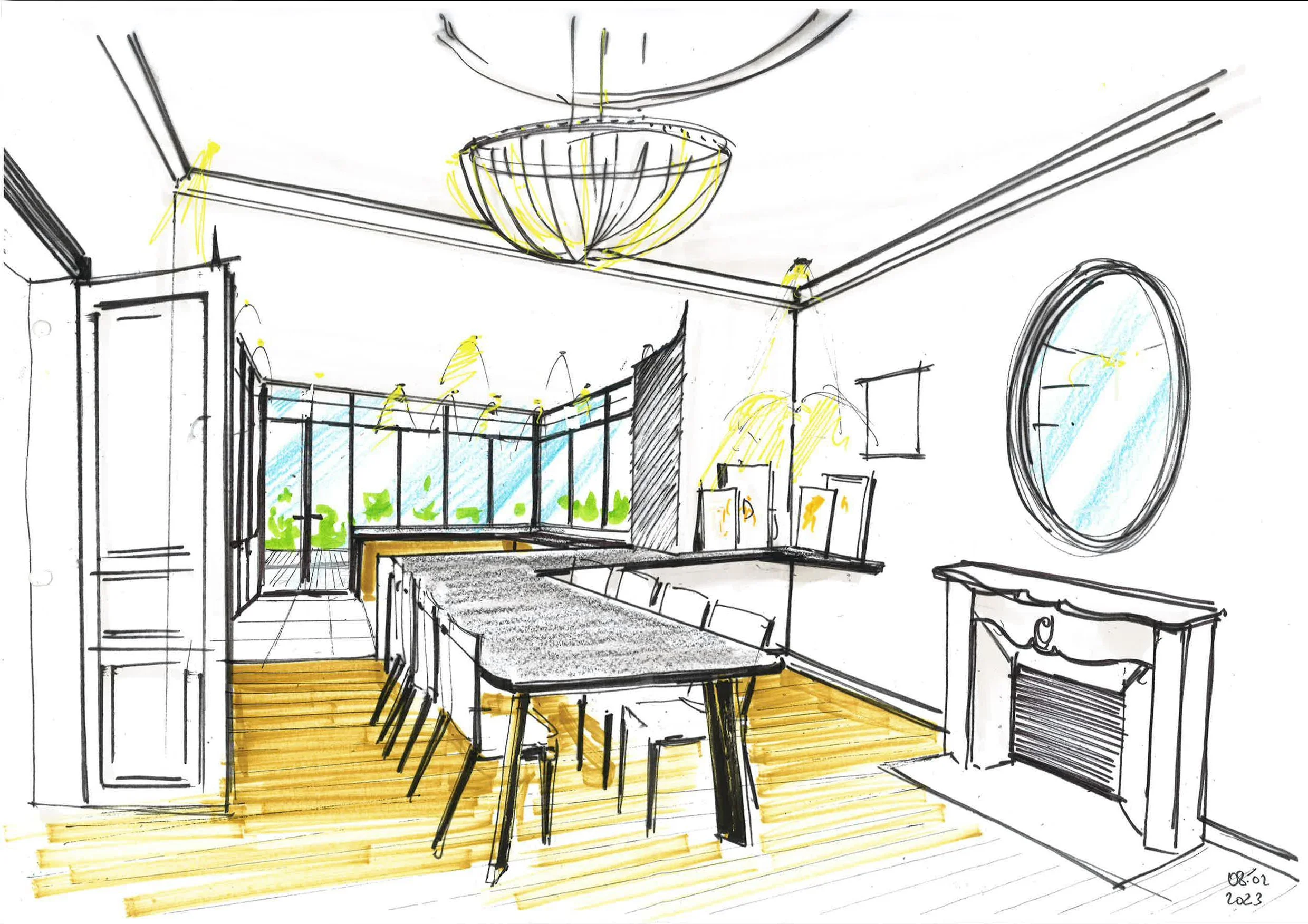 Des corniches en plâtre ont été ajoutées afin de redonner du relief et du caractère à la pièce.L’éclairage intégré, particulièrement discret, assure une mise en valeur subtile des volumes sans altérer la pureté des lignes.