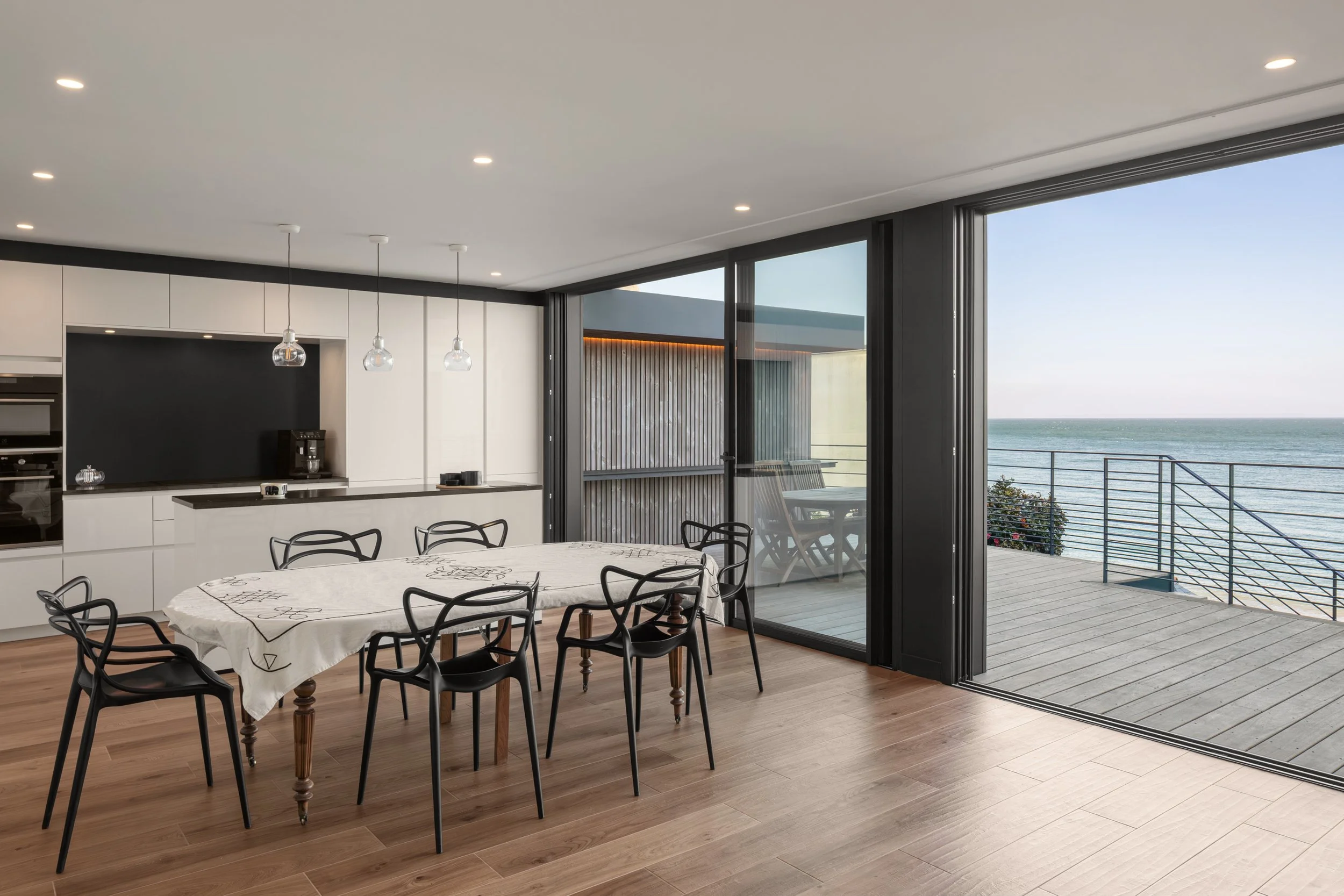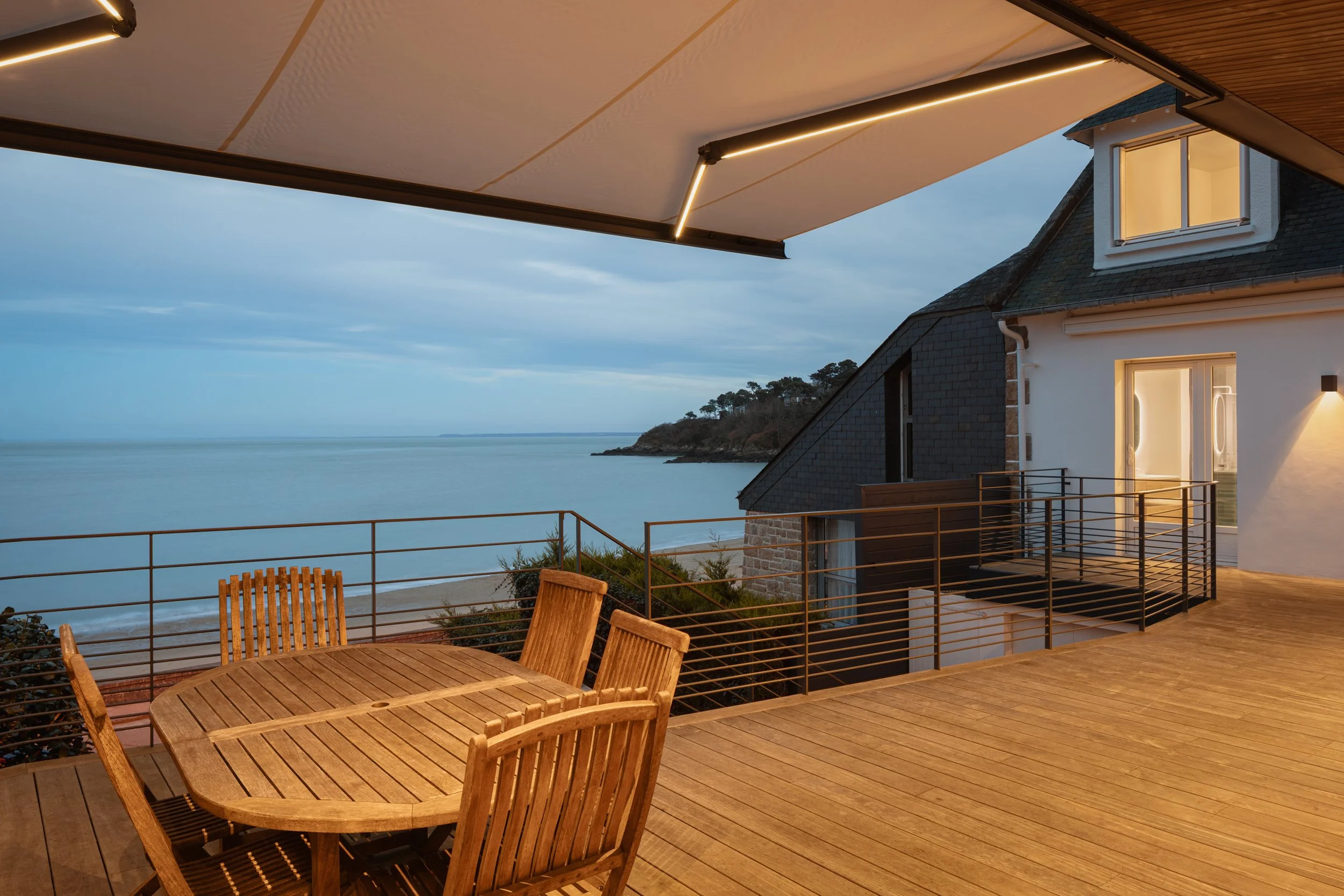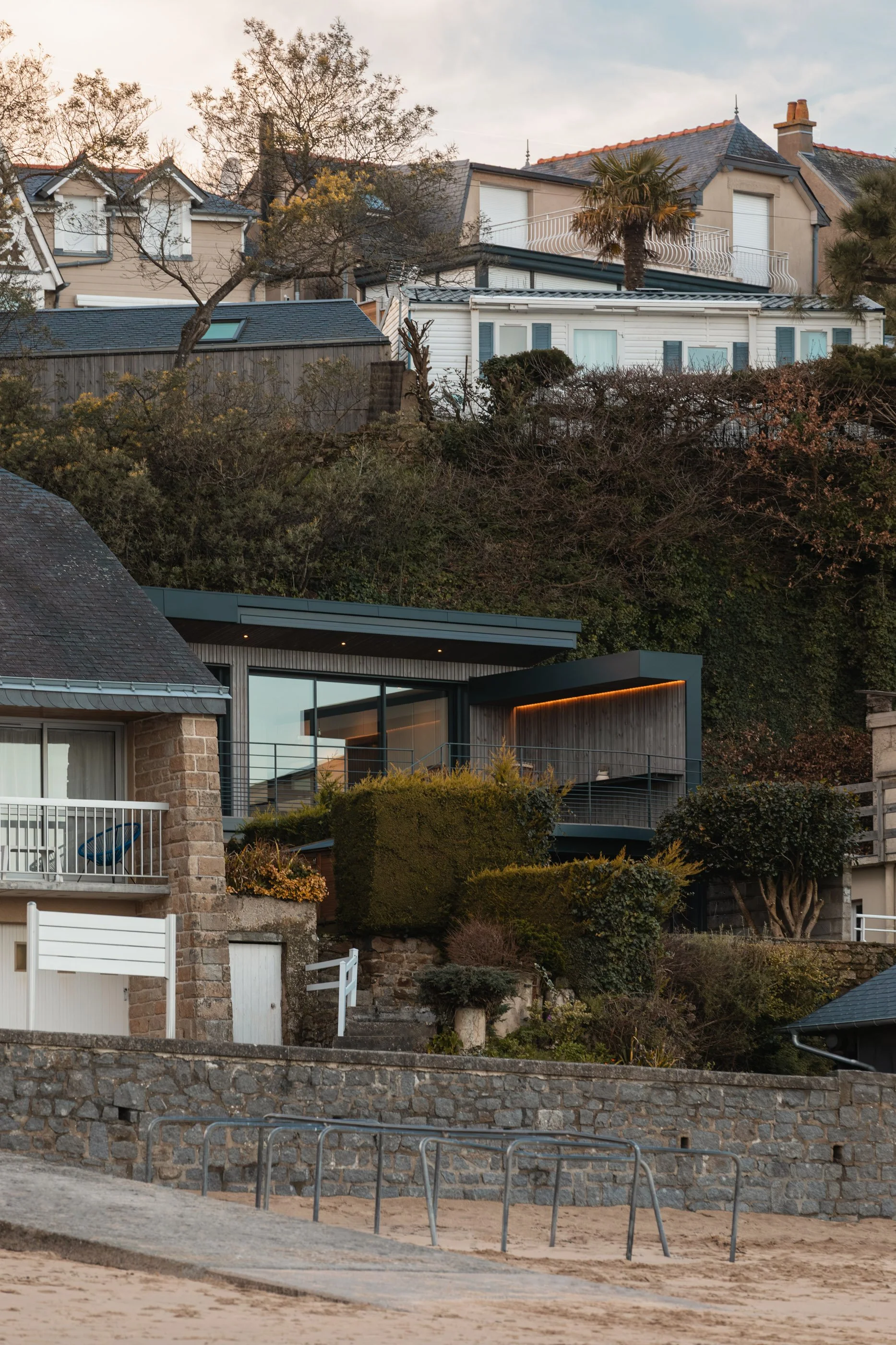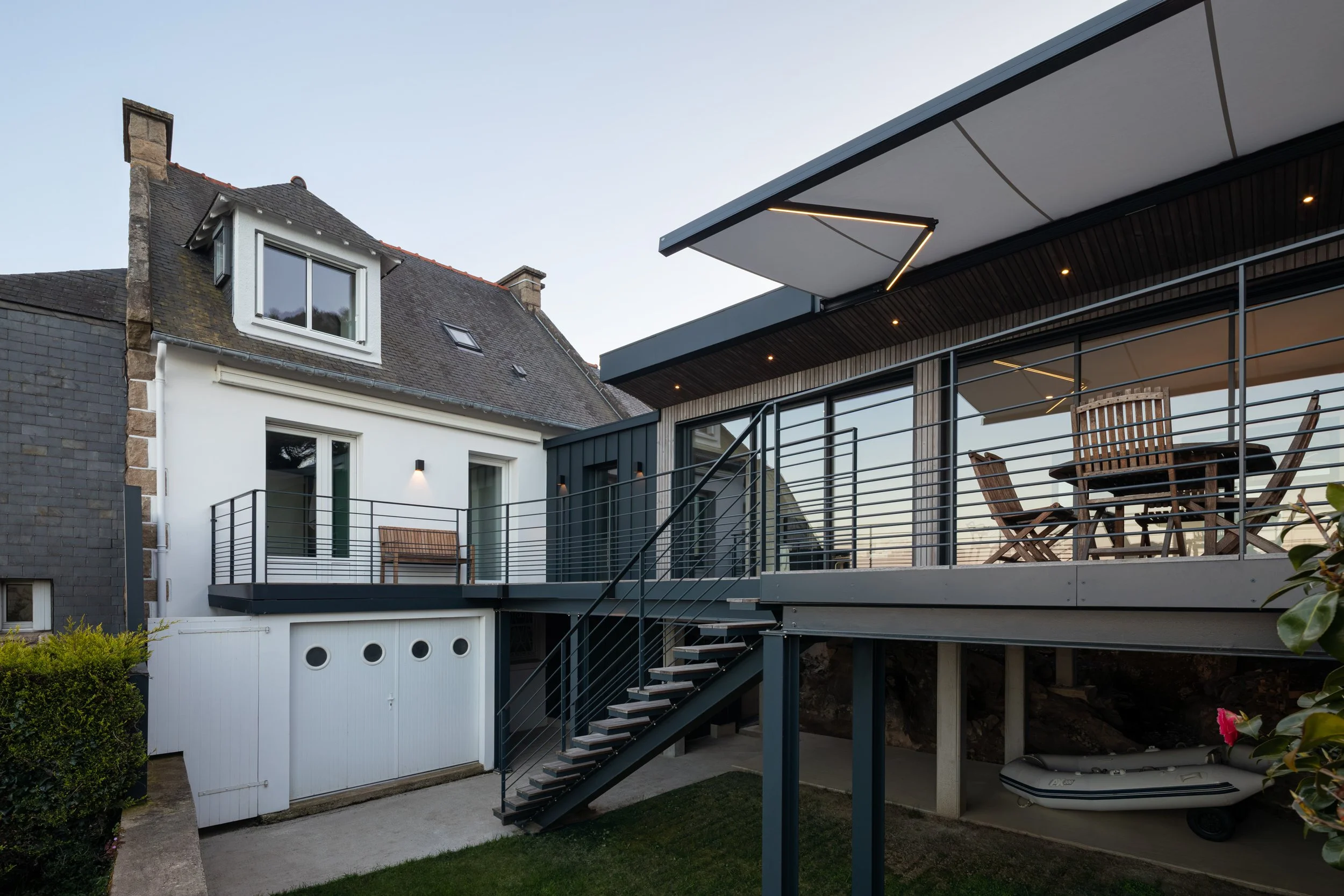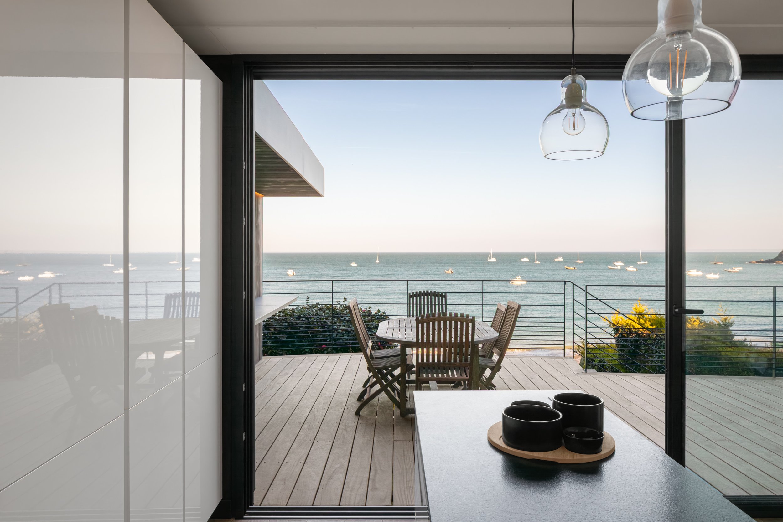 La façade de l’extension domine la baie. Cette nouvelle terrasse devient à la fois la liaison entre l’extension et l’ancienne petite maison et profite de ce tableau vivant.