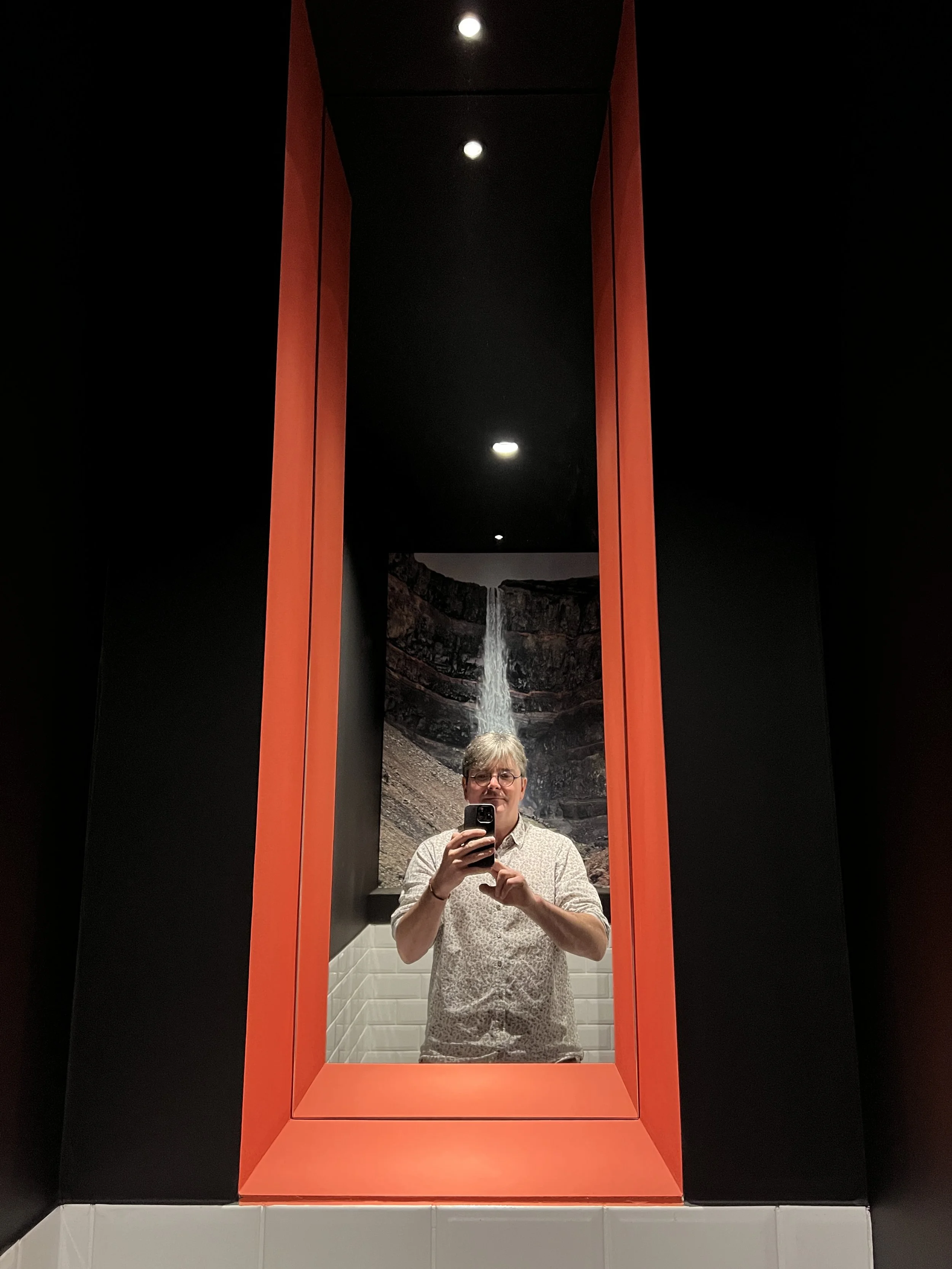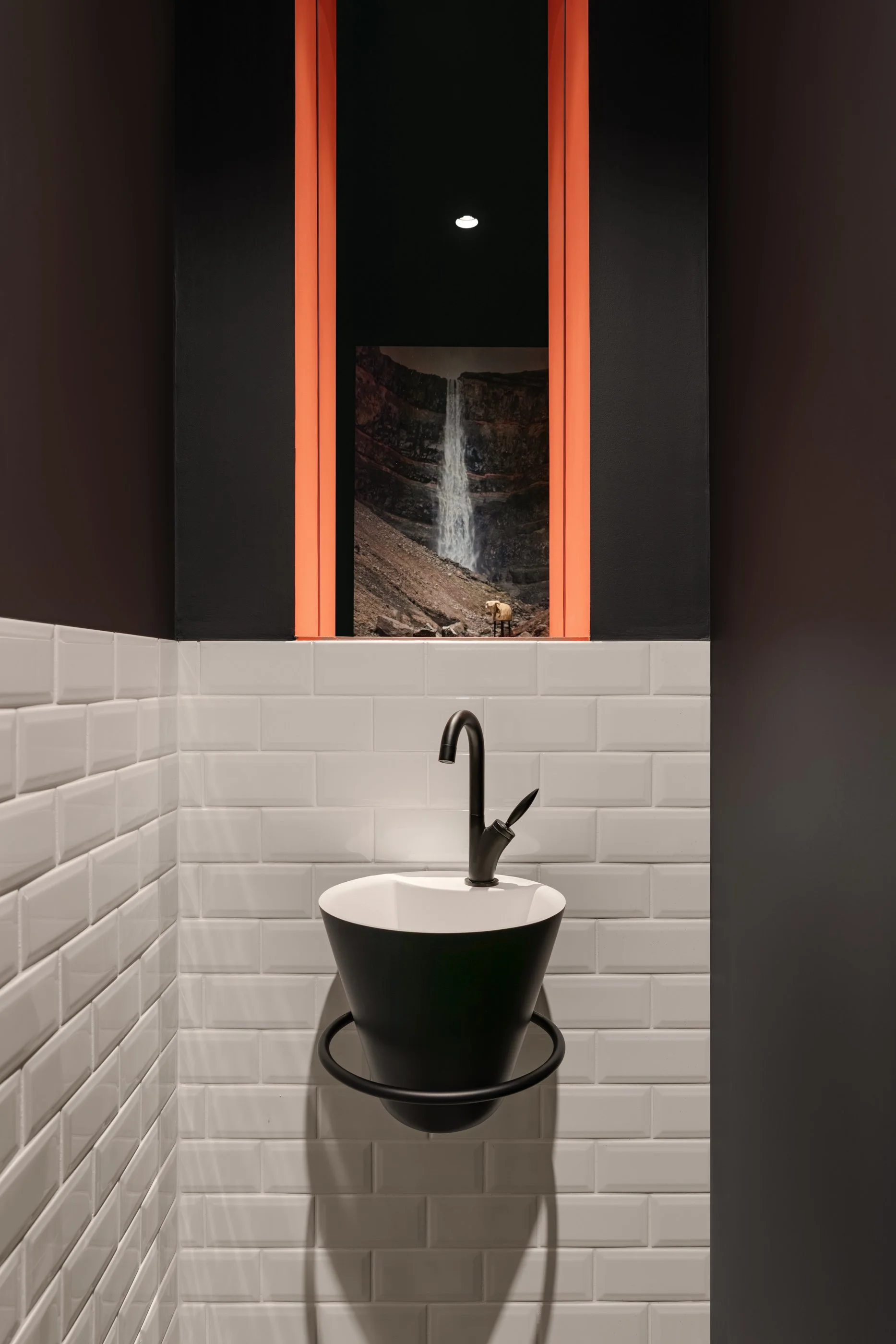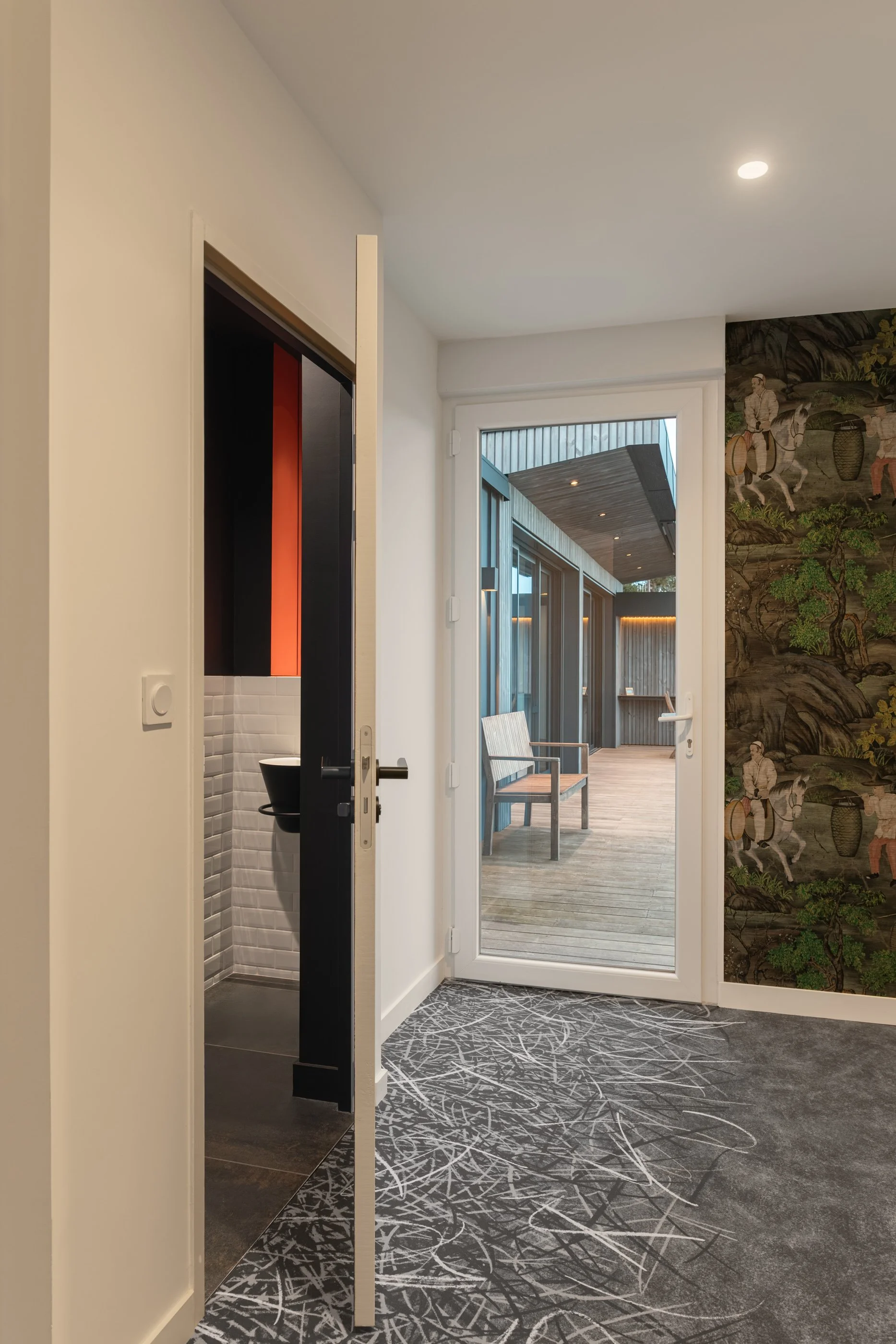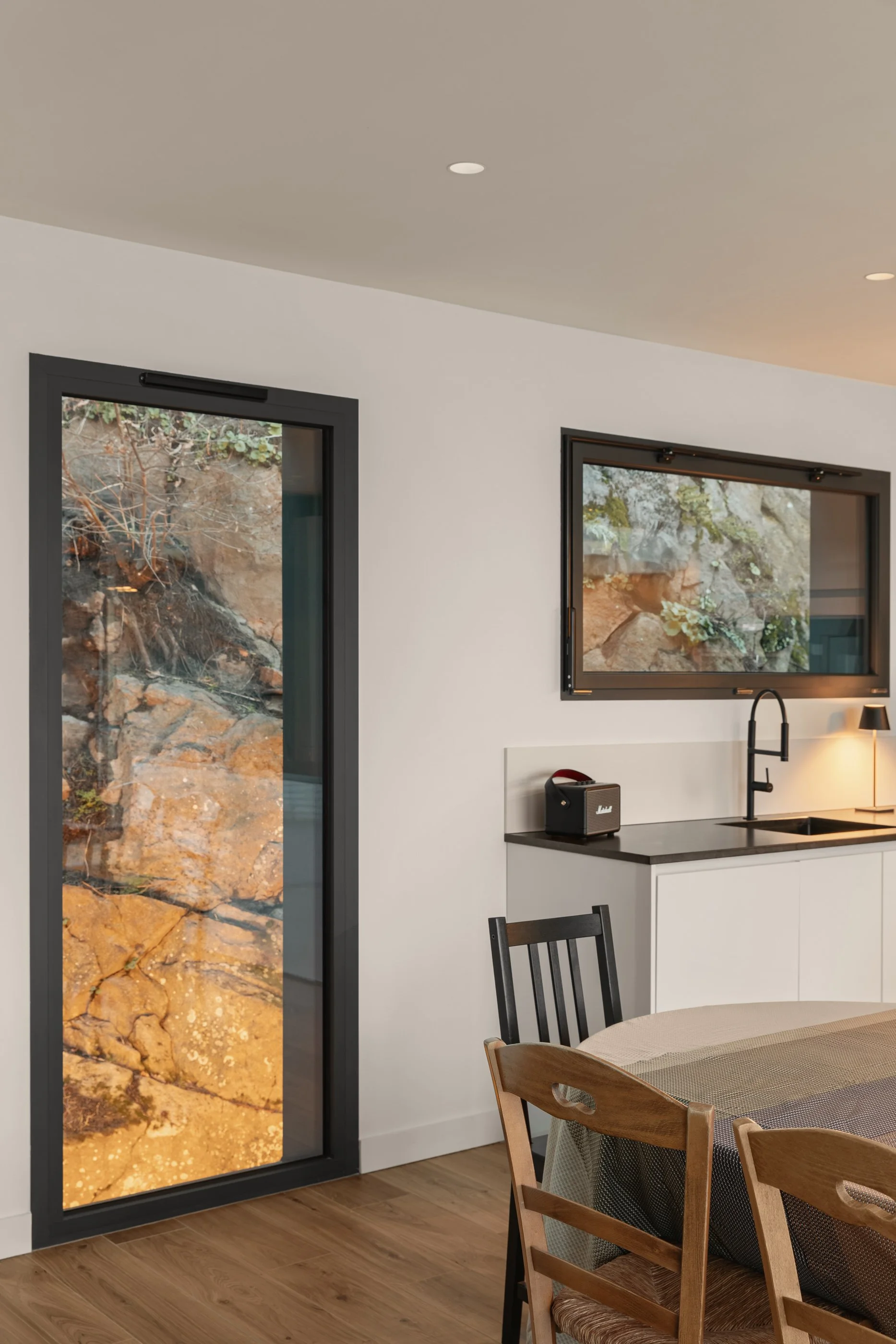Le soir, l’éclairage extérieur met en valeur la roche parée de ses lichens et fougères , transformant la longue ouverture verticale en véritable tableau venant révéler la beauté naturel de ce décor.