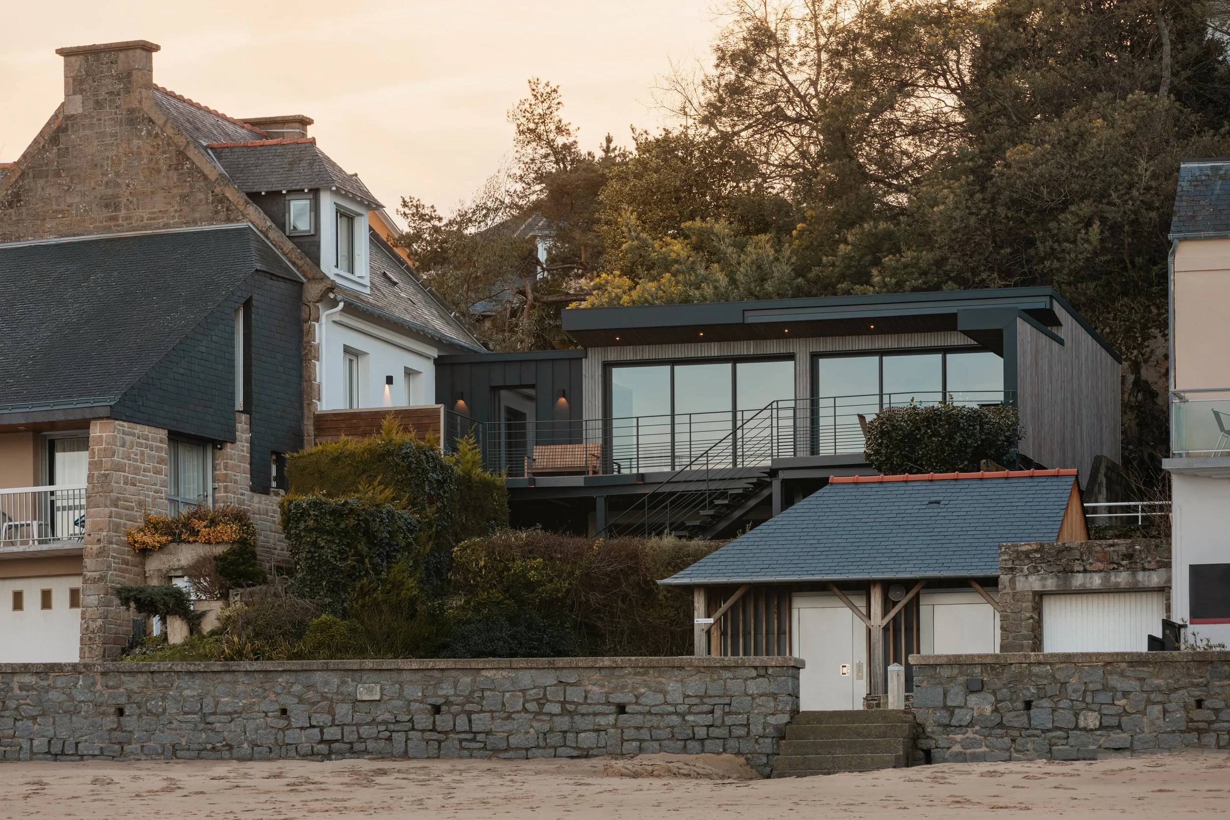 L’ancienne petite maison a retrouvé sa façade blanche initiale typique des maisons bretonnes et l’extension est venu s’implanter à la perpendiculaire du bâti. Grâce a un toit plat en aluminium noir mat et un bardage mutuellement frisé (?) . Seules les baies en verre révèlent l’habitation par le reflet de la mer.