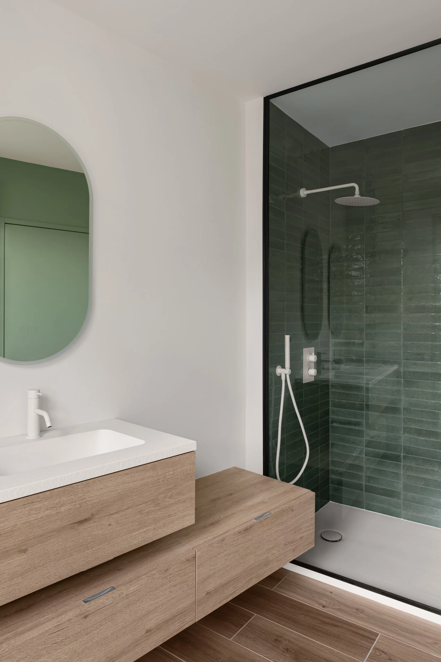 La petite maison est à l’origine composée d’un garage, une chaufferie au sous-sol, d’une pièce de vie salon/ salle à manger, d’une cuisine fermée et de 4 chambres répartis sur 3 niveaux. Le bâti existant a été remanié et est dédié aujourd’hui à l’espace nuit : 5 chambre, 2 WC et 2 salles de bain rénovées et 1 nouvelle.