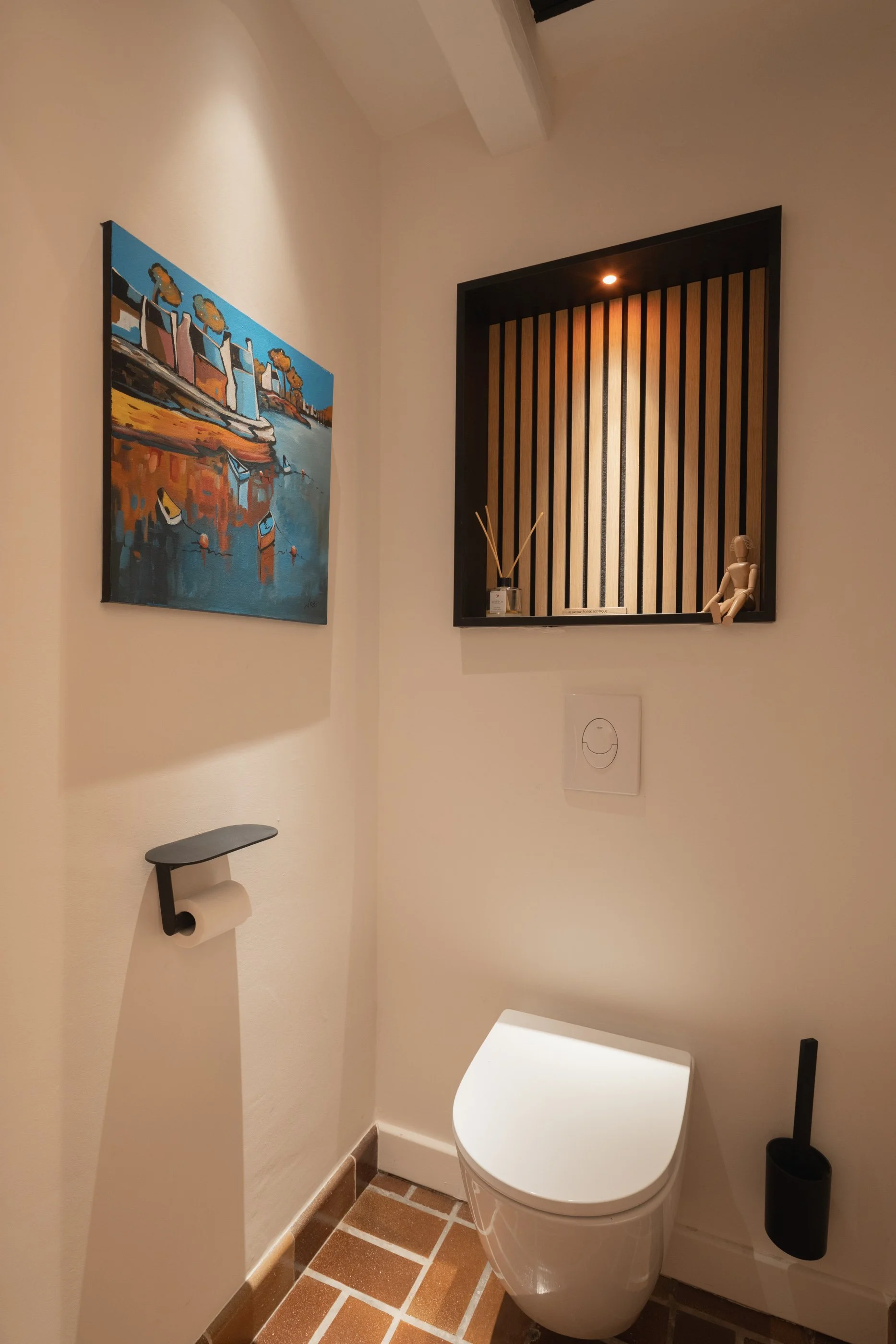 Le carrelage et la faïence d’origine a été conservée et mise en valeur par des éclairages subtils et des teintes contrastées