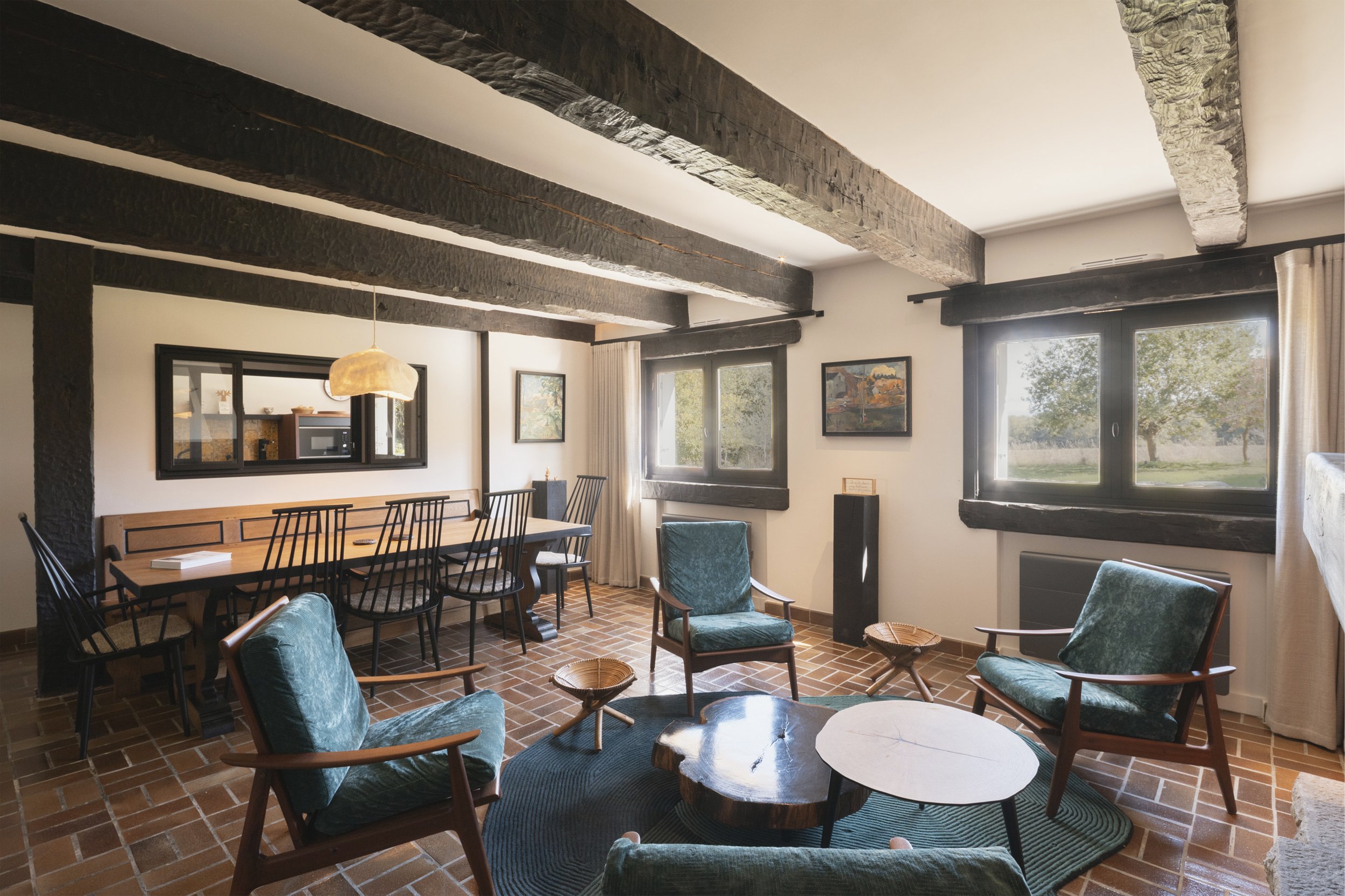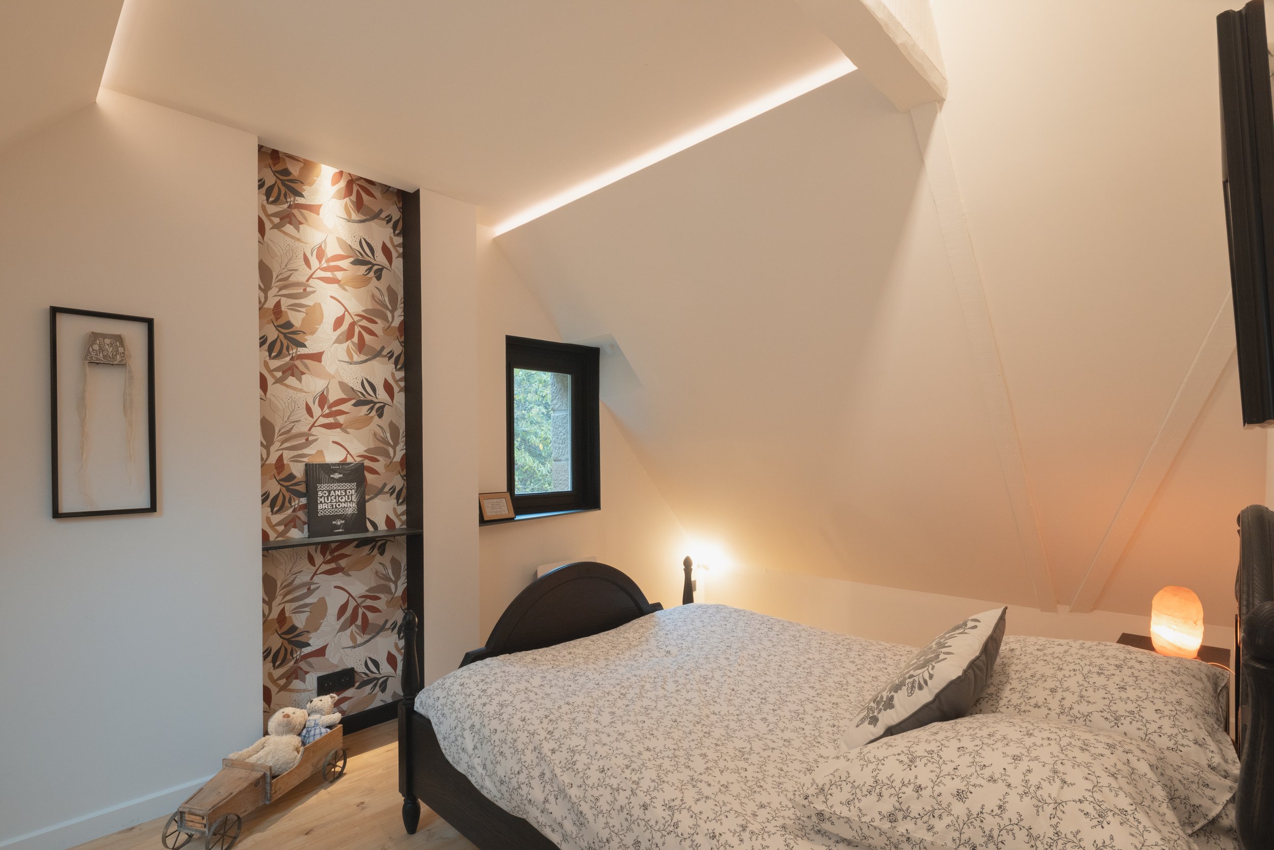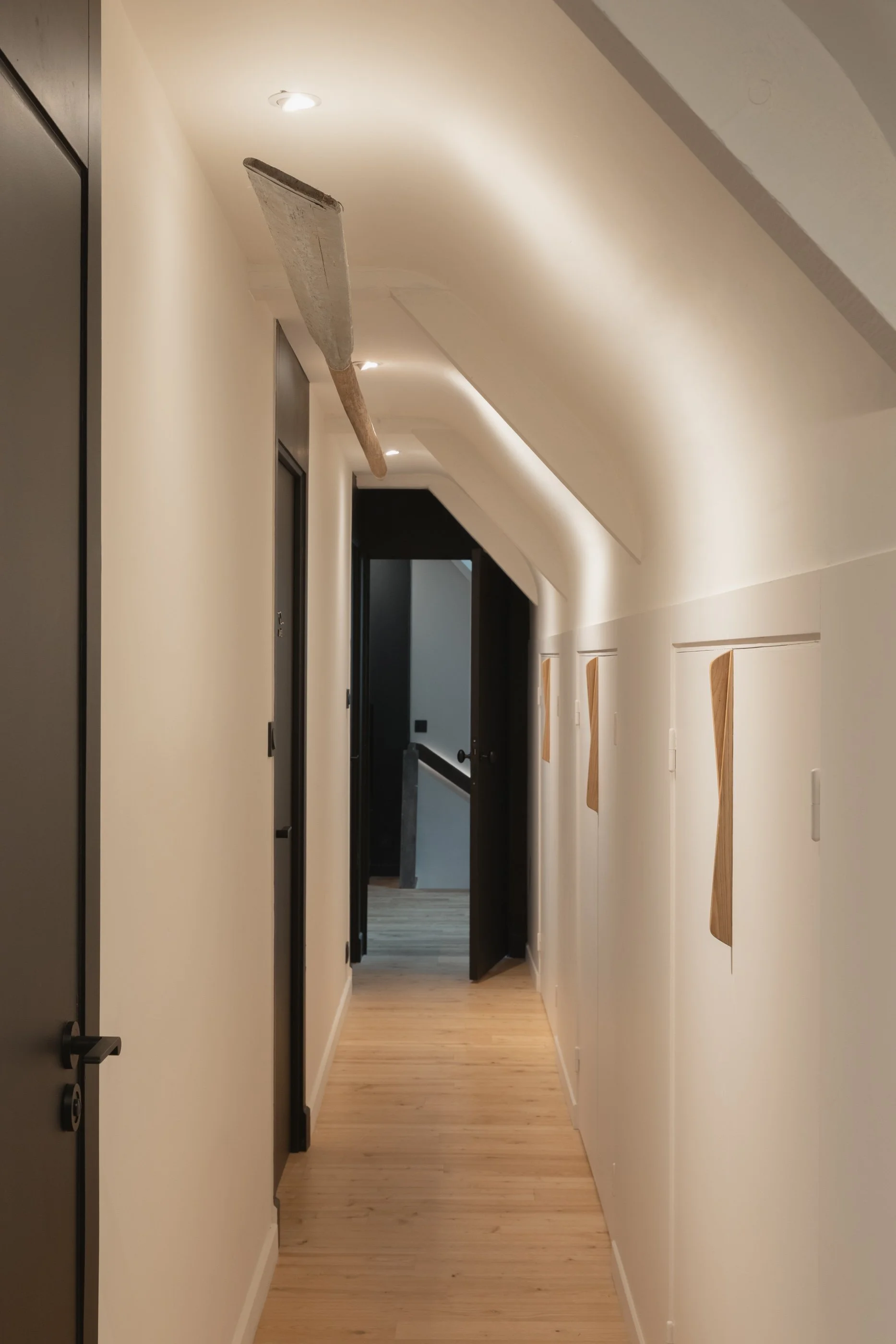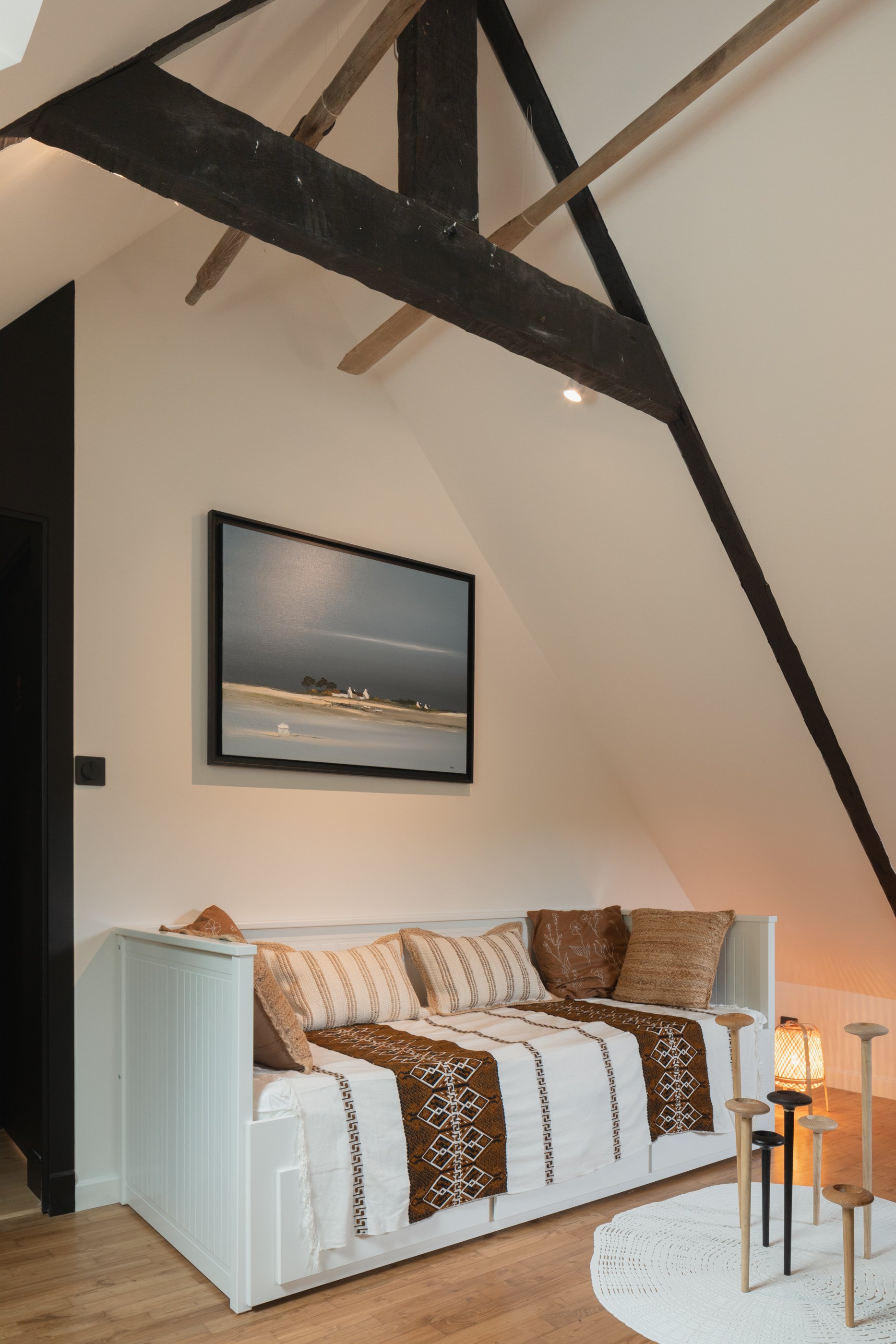 Les poutres d’origine noires ont été conservées afin de donner le rythme et les contrastes. Une intention à l’image du drapeau Breton du Gwenn Ha Du .