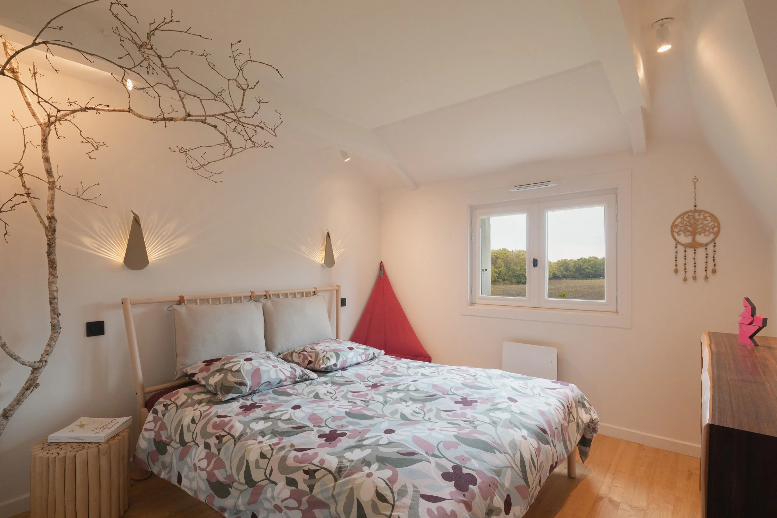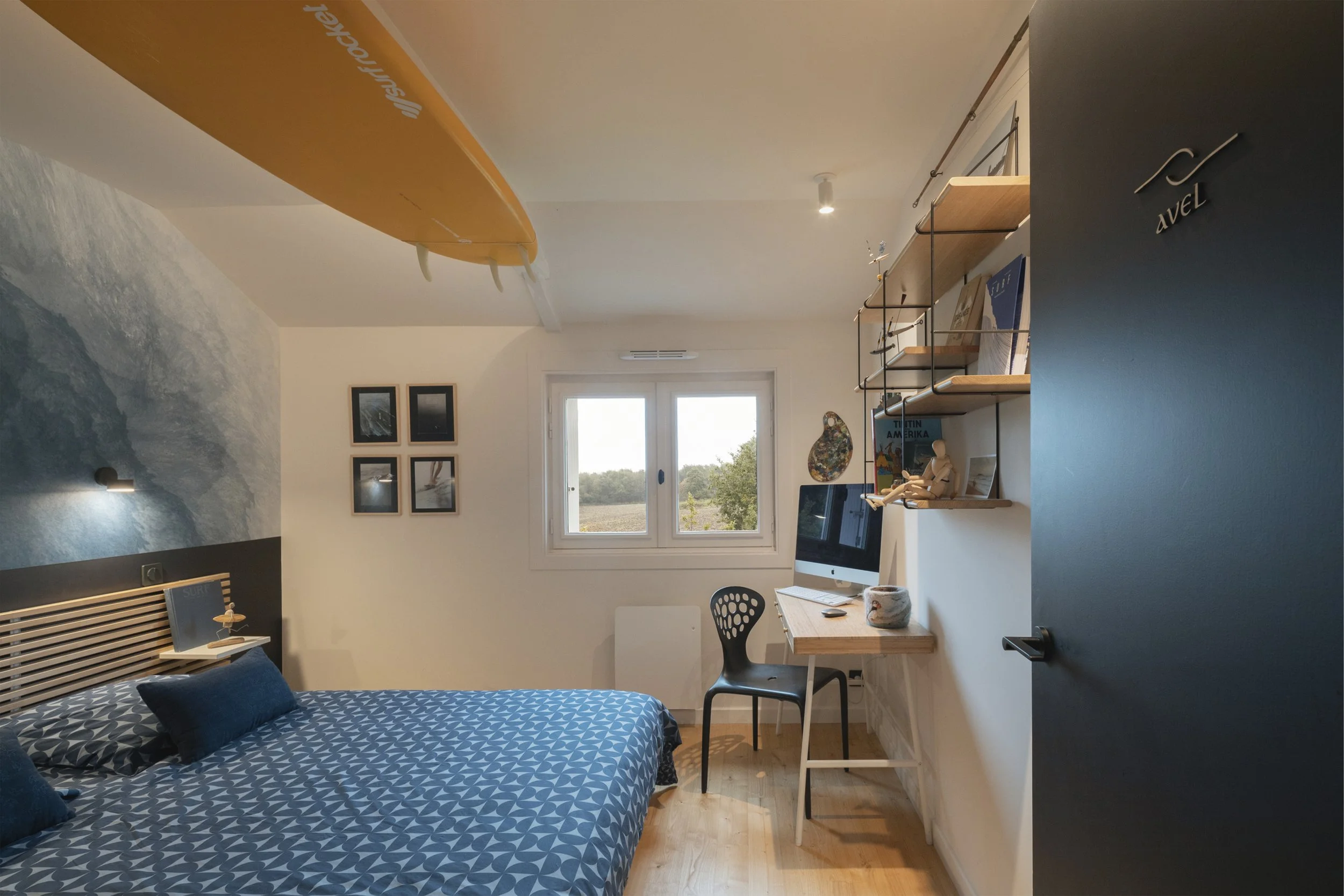 Dans la Chambre baptisée OGOOUÉ le grand meuble commode aux 9 tiroirs a été dessiné par Erwan. Il a trouver sa place sous la fenêtre.