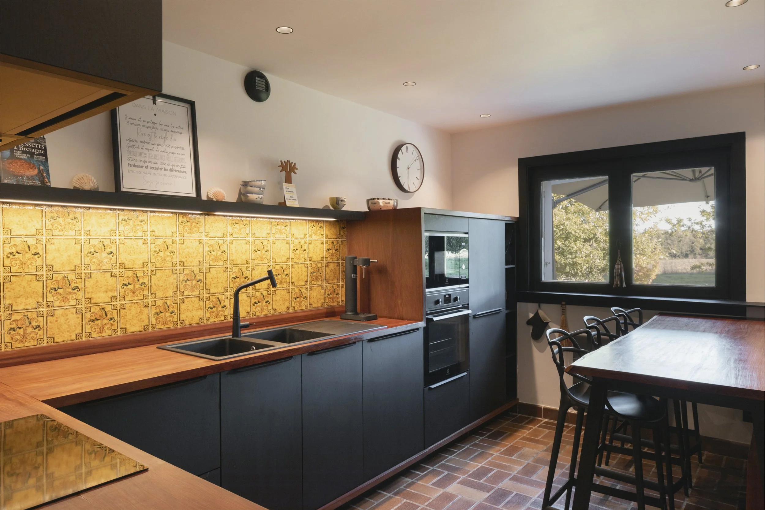 La cuisine a été redessinée dans son intégralité. Les faïences d’époque mise en valeur par l’éclairage, on été remanié afin de s’adapter au nouvel aménagement.